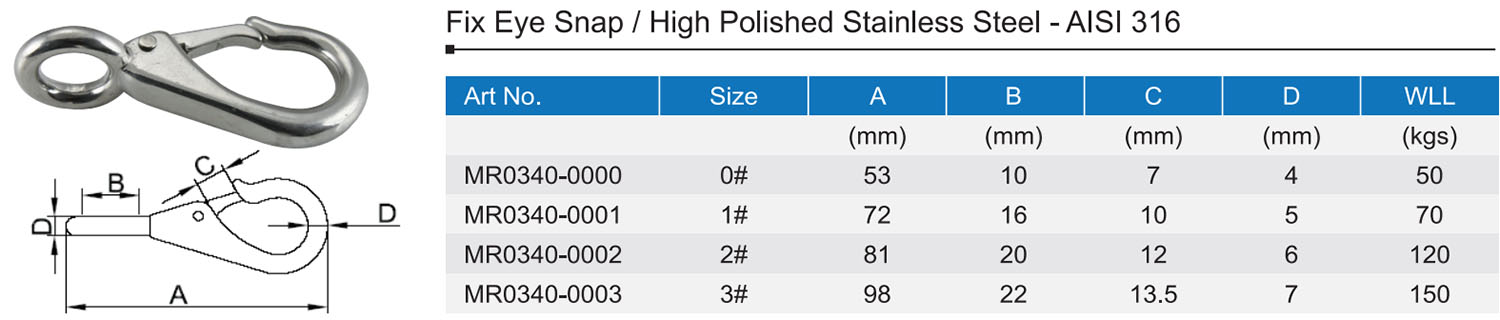 Also called: Rigid Eye Snap Hook, Fixed Eye Boat Snap, Fast Rigid Snap Hook, Fixed Eye Snap Hook, Eye Snap Fixed Ring.