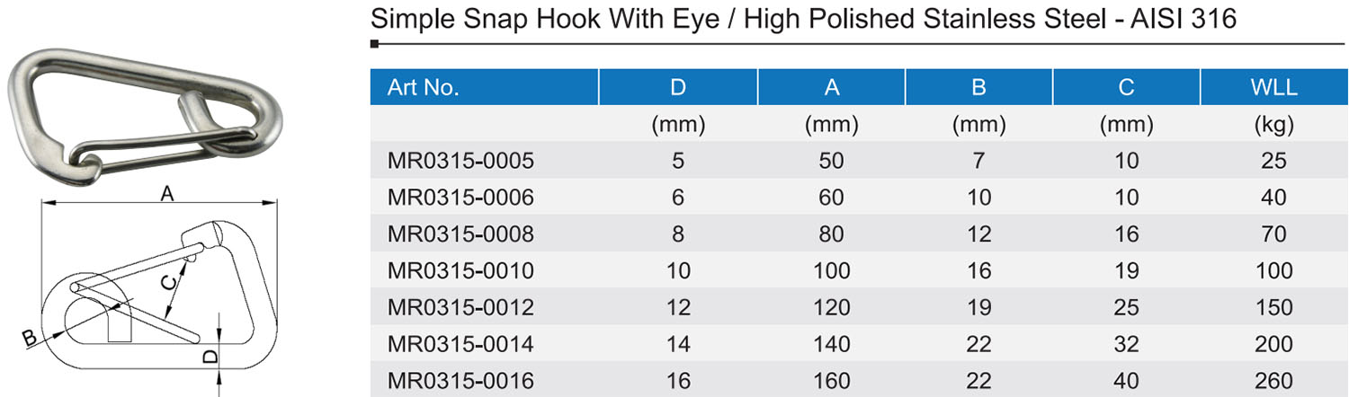 Also called: Sping Snap Angled Hook With Eye End, Harness Clip, Asymmetric Carabiner, etc.