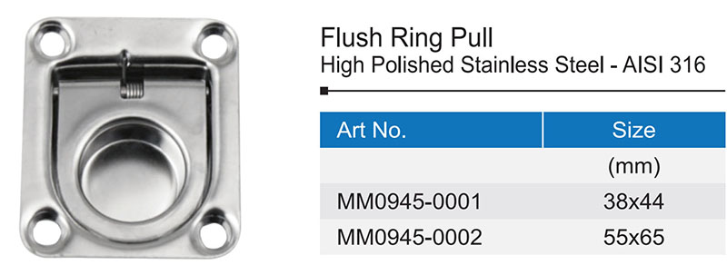 Also called: Spring Loaded Flush Ring Pull, Spring Lift Ring, Flush Lift Ring Stamped.